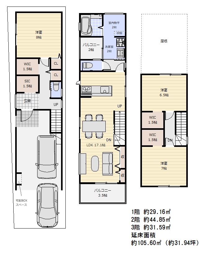 3階建 延床面積 105.68㎡(約32.00坪)まで